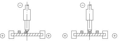 接地端在生產過程中總是預先接好,在焊接過程中,由于工件慢慢被磁化,將發生電弧向接入端的另一面偏移。此時應盡早接入另一根規格相同的地線,長度相同,以防止工件被磁化而發生磁偏吹。如下圖2-1所示: